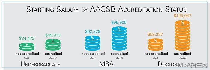 實(shí)際上不同國際院校MBA畢業(yè)生的薪資有著明顯的差異。尤其是AACSB院校和非AACSB院校的MBA畢業(yè)生之間的薪資差距。據(jù)權(quán)威數(shù)據(jù)顯示,非AACSB院校的本科畢業(yè)生平均年薪約為3萬4千美金,AACSB院校的本科畢業(yè)生平均年薪接近5萬美金,二者每年收入相差近1萬6千美金。非AACSB院校MBA畢業(yè)生的平均年薪為6萬2千萬美元,而AACSB院校MBA畢業(yè)生平均年薪近9萬9千美元,差距擴(kuò)大至3萬7千美元。