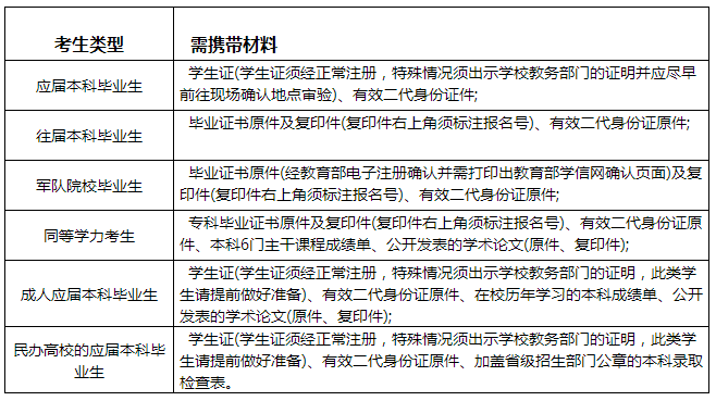 考生現(xiàn)場確認應提交本人居民身份證、學歷證書(普通高校、成人高校、普通高校舉辦的成人高校學歷教育應屆本科畢業(yè)生持學生證)和網(wǎng)上報名編號,由報考點工作人員進行核對。報考“退役大學生士兵專項碩士研究生招生計劃”的考生還應提交本人《退出現(xiàn)役證》。