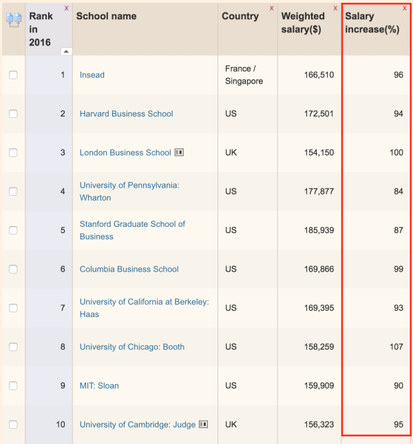 《金融時(shí)報(bào)》世界排名前10位的商學(xué)院平均漲幅為94.5%。