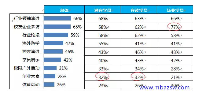 學員最感興趣的活動是行業(yè)領袖演講和校友企業(yè)參訪;與潛在和在讀學員相比,畢業(yè)學員對校友企業(yè)參訪更加熱衷;潛在和在讀學員參與創(chuàng)業(yè)大賽的意愿比畢業(yè)學員更高。