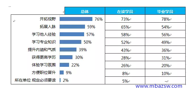 優(yōu)唯通過案頭研究、大數(shù)據(jù)分析、在線網(wǎng)絡調(diào)研問卷和深度訪談,有如下發(fā)現(xiàn),開拓視野、拓展人脈和學習經(jīng)驗和知識是學員報讀EMBA的主要原因;