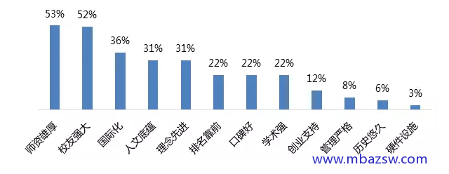 師資力量雄厚和校友資源強大被認為是理想EMBA院校最應具備的兩個特點,其次是國際化程度高、人文底蘊深厚和教育理念先進。