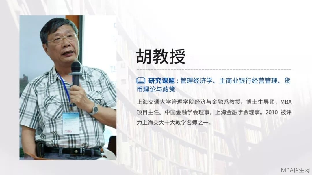 上海交通大學(xué)MBA教授,交通大學(xué)安泰管理學(xué)院經(jīng)濟(jì)與金融系教授、博士生導(dǎo)師、經(jīng)濟(jì)學(xué)博士,1999年胡教授當(dāng)選為上海市金融學(xué)會(huì)第四屆理事會(huì)理事,貨幣理論和貨幣政策研究專業(yè)委員會(huì)副主任,被評(píng)為年度最受學(xué)員歡迎的教授之一。