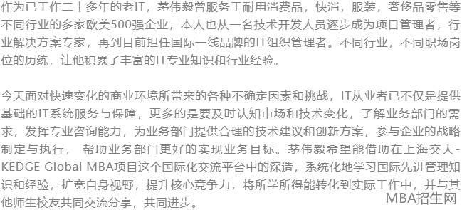 作為安泰保險中國區(qū)IT負責人,張建生在IT戰(zhàn)略制定、核心技術系統(tǒng)建設優(yōu)化、信息安全體系建設等領域有豐富開發(fā)交付成功經(jīng)驗。張建生希望通過在上海交大-KEDGE Global MBA項目的進一步深造,能夠從全球化視角,專業(yè)系統(tǒng)化理解國際經(jīng)營管理框架,提升自己的核心能力,賦能行業(yè)數(shù)字化轉(zhuǎn)型創(chuàng)新,踐行企業(yè)及行業(yè)的責任和擔當