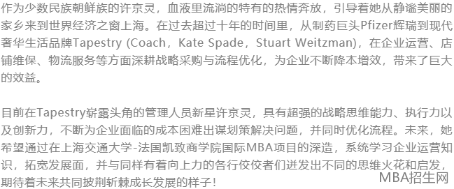 作為三家公司的投資人及總經(jīng)理,董彥汐具備獨到的商業(yè)嗅覺,具有開拓創(chuàng)新能力,善于挖掘各類創(chuàng)新業(yè)務;同時她具有突出的溝通親和力和執(zhí)行力,在商業(yè)領域信譽度極好。通過本次上海交通大學-法國凱致商學院聯(lián)辦的Global MBA項目進修學習,董彥汐希望可以全方位提高個人領導能力和商業(yè)管理能力,開拓商業(yè)嗅覺,在未來的商業(yè)創(chuàng)業(yè)和投資領域得到更好的發(fā)展。
