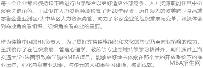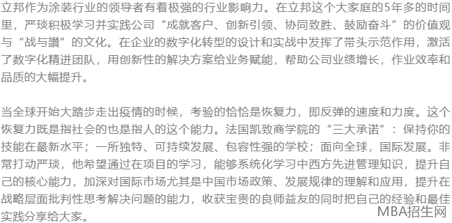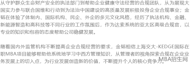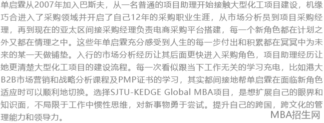 作為擁有豐富職場經(jīng)驗的管理者與企業(yè)家,TA們都選擇了上海交大-KEDGE Global MBA項目以賦能自身,成就職業(yè)發(fā)展。身處快速變革且充滿不確定性的大環(huán)境中,希望學員們能夠通過MBA項目的就讀塑造開放、包容、可持續(xù)的視角,與學校、社會和世界建立高質(zhì)量聯(lián)結(jié)!