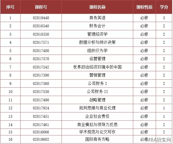 ? 開設(shè)課程:會計學(xué)、應(yīng)用統(tǒng)計學(xué)、規(guī)劃與決策、管理經(jīng)濟學(xué)、組織行為學(xué)、市場營銷、生產(chǎn)與作業(yè)管理、公司財務(wù)、戰(zhàn)略管理