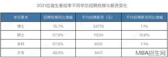 在表格中看到,其中碩士生招聘薪資漲幅較明顯。近幾年,MBA的報考熱度與日俱增,很多人報考MBA是看中了它的含金量,目的是希望能夠提升學歷的同時可以升職、加薪,在職場上走向人生巔峰。那到底MBA畢業(yè)生的就業(yè)趨勢和薪酬水平是怎樣的?讀完MBA工資究竟能漲多少錢呢?