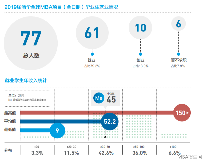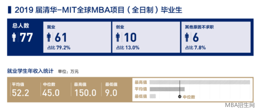 清華大學經(jīng)濟管理學院MBA2019年就業(yè)報告中,雖僅單獨列出了MIT項目的薪資信息,但也不難看出,MBA畢業(yè)生薪資水平較高,平均年薪為52.2萬元,高年薪高達150萬,年薪中位數(shù)為45萬元。