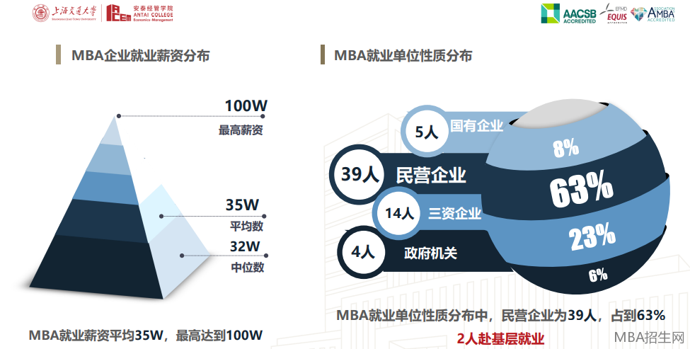 上海交通大學安泰經(jīng)管學院2020年就業(yè)報告中,畢業(yè)生就業(yè)領(lǐng)域以互聯(lián)網(wǎng)、高新科技和金融行業(yè)為主,MBA就業(yè)薪資平均35W,高達到100W。MBA就業(yè)單位性質(zhì)分布中,民營企業(yè)為39人,占到63%,2人赴基層就業(yè)。