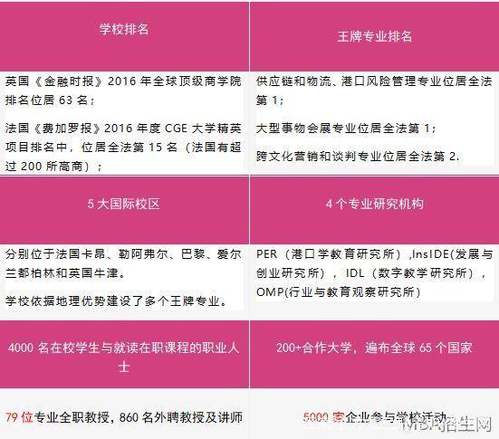 學(xué)校被歐洲管理基金會(huì)EFMD和美國(guó)國(guó)際管理教育聯(lián)合會(huì)AACSB、歐洲EQUIS, EPAS及BSIS認(rèn)證,也是CGE法國(guó)大學(xué)校協(xié)會(huì)的成員,相當(dāng)于中國(guó)的“211工程”,被中國(guó)與法國(guó)教育部同時(shí)認(rèn)證,是歐洲領(lǐng)先的商業(yè)和管理學(xué)院之一。全世界Top-90商學(xué)院中,該校排名63,英國(guó)(《金融時(shí)報(bào)》2016年12月數(shù)據(jù))。GE大學(xué)校精英項(xiàng)目全法第15(《費(fèi)加羅報(bào)》2016年度)。