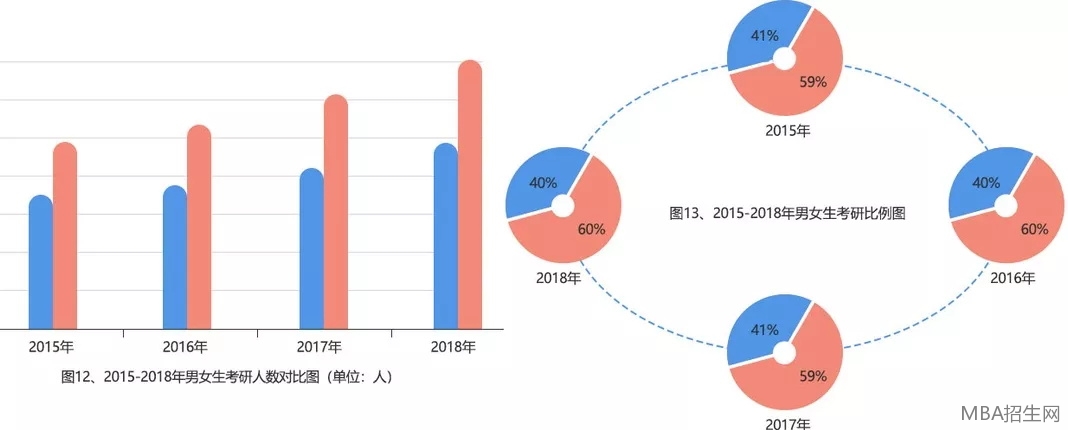 碩士研究生招生規(guī)模不斷增長的同時,女生考取研究生的比例不斷提高,女生成考研群體主流。