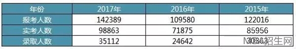 從近三年招錄人數(shù)分析,報考人數(shù)大致以2萬左右遞增,實考人數(shù)緊跟上升,錄取人數(shù)穩(wěn)定在3萬人上下浮動。從長遠數(shù)據(jù)看,每隔2-3年錄取人數(shù)會有一次躍升。從報考趨勢可以看出,報考人數(shù)逐年上漲,MBA等管理類聯(lián)考報考項目熱度不減。